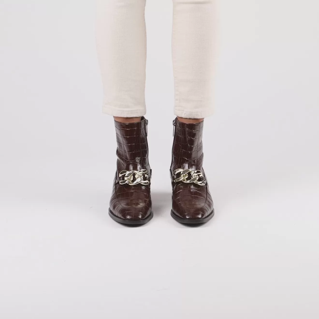 Chain-Link Trim Elevates The Rizia Ankle Boot, Designed In Both Calf Leather And Crocodile Iterations. Perennially Chic And Always Versatile, This Look Translates Effortlessly From Work To Weekends. The Low Heel Ensures Total Comfort And Ease Of Movement.