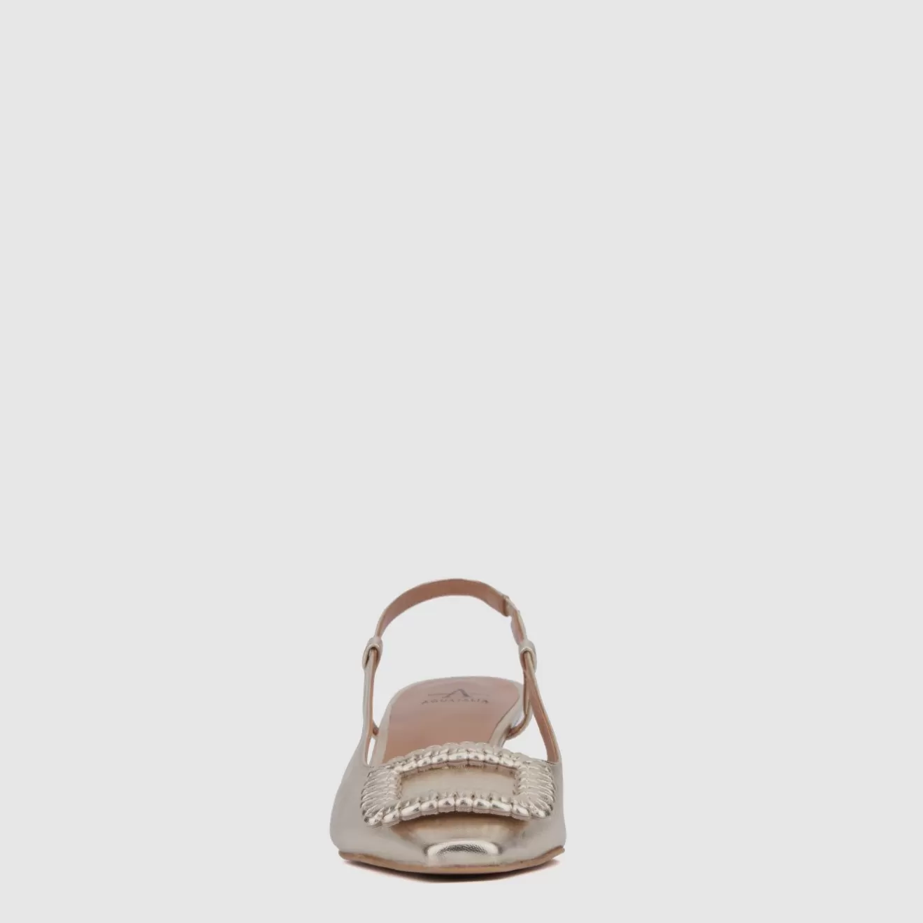 Pretty Meets Practical In Our Arabella Slingback, Crafted In Dress Suede As Well As Shimmery Metallic Leather. Designed With A Snipped-Toe Silhouette, Woven Square Accent On Front And Scratch-Resistant Lacquered Heel, It’S Finished With Elastic In Back For Ease Of Wear. A Chic Complement To Skirts And Dresses As Well As Trousers, It Translates From 9 To 5 And 5 To 9 In Style.