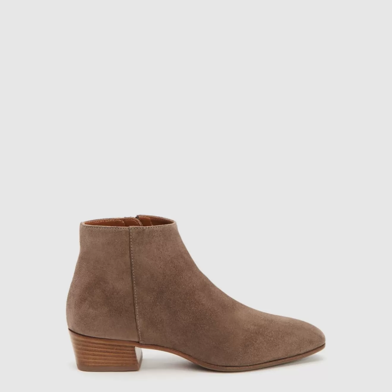 Pointy Toe Suede Bootie With An Inside Zip On A Stacked Heel. Now Available In Wide Widths.